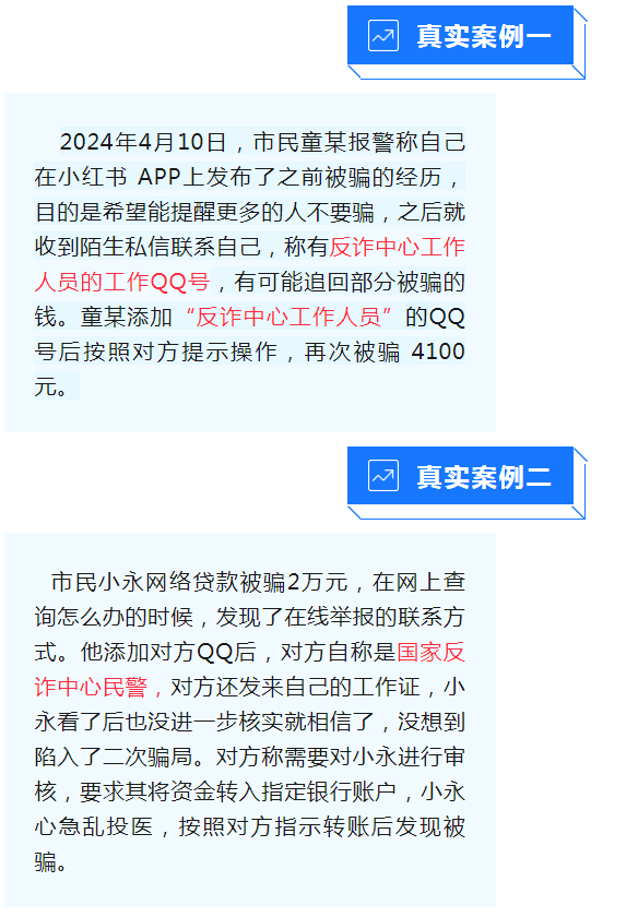 受害人在QQ、網(wǎng)上搜索“反詐中心”“在線(xiàn)報(bào)警”,騙子會(huì)假模假樣地指導(dǎo)受害人提供證據(jù)材料,再提出讓受害人向指定賬戶(hù)轉(zhuǎn)賬,最后導(dǎo)致受害人二次陷入騙局。