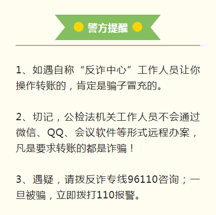 現(xiàn)實(shí)工作中,民警要先了解情況,進(jìn)行核實(shí)調(diào)查,不會(huì)在網(wǎng)上辦案、更不會(huì)要你轉(zhuǎn)賬!